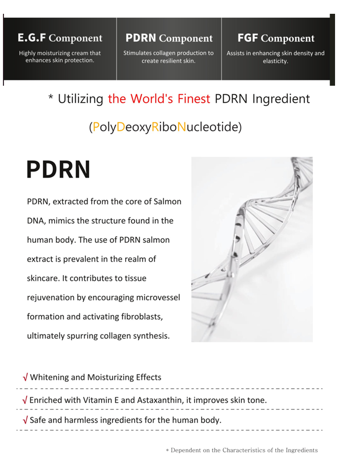 PDRN (Poly Deoxy Ribo Nucleotide) is a component similar to DNA in human body and helps to regenerate tissues quickly by stimulating continuous production of growth factors in our skin DNA.